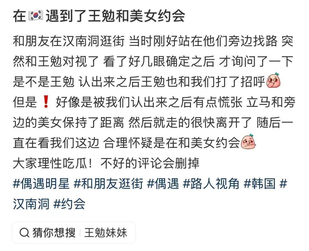 今号,有网友在韩国汉南洞拍到王勉和一个高挑卷发女生逛街,被认出后两人赶紧拉开距离快步走,王勉还频频回头,看着特别慌张。